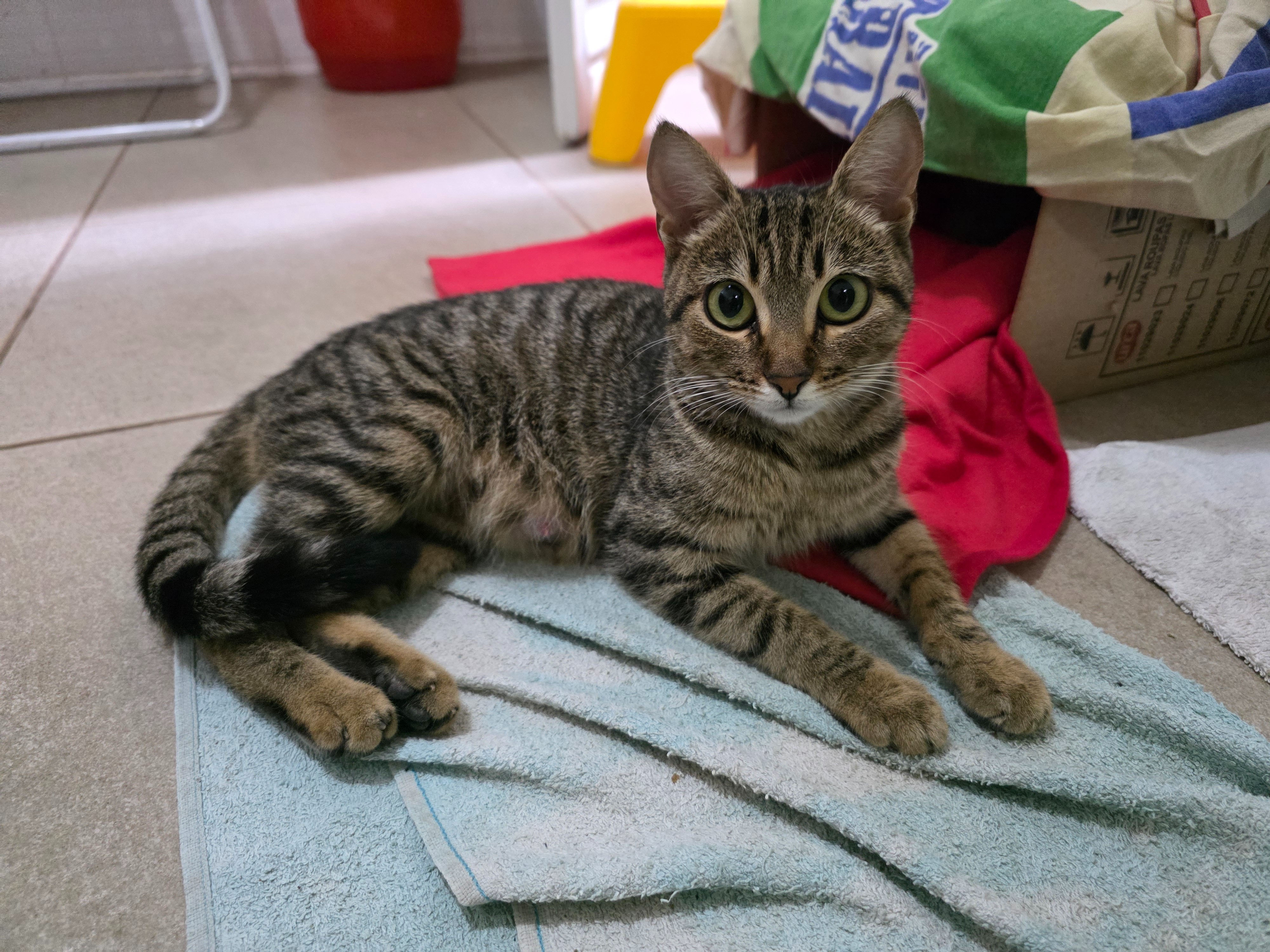 Gata média, 7 a 11 meses, SRD-ViraLata, cor Rajada.